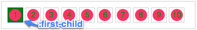 :first-child是用来选择某个元素的第一个子元素,比如我们这里的这个demo,你想让列表中的"1"具有与从不同的样式,我们就可以使用:first-child来实现: