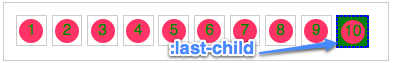 <div class="demo clearfix"> <ul class="clearfix"> <li class="first links odd" id="first"><a href="">1</a></li> <li class="links even"><a href="">2</a></li> <li class="links odd"><a href="">3</a></li> <li class="links even"><a href="">4</a></li> <li class="links odd"><a href="">5</a></li> <li class="links even"><a href="">6</a></li> <li class="links odd"><a href="">7</a></li> <li class="links even"><a href="">8</a></li> <li class="links odd"><a href="">9</a></li> <li class="links even last" id="last"><a href="">10</a></li> </ul> </div>
