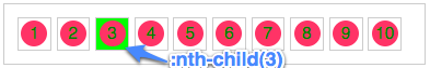 - :nth-child()选择某个元素的一个或多个特定的子元素;