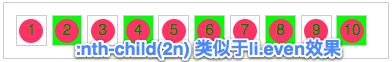 “:nth-child(2n)”也等于":nth-child(even)"效果。