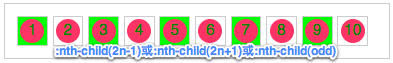 其实实现这种奇数效果,我们还可以使用":nth-child(2n+1)"和":nth-child(odd)",一起来看他们的效果