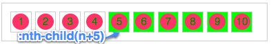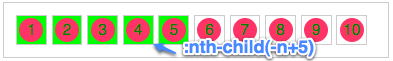 :nth-child(-n+5)这种选择器刚好和上面的选择器相反,这个是选择第5个前面的,如: