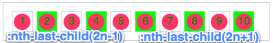 :nth-last-child(2n),这个表示的是从元素后面计算,选择的是偶数个数,从而反过来说就是选择元素的奇数,和前面的":nth-child(2n+1)",":nth-child(2n-1)",":nth-child(odd)"所起的作用是一样的。如: