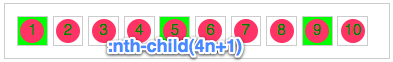 .demo li:nth-last-child(2n+1) {background: lime;} .demo li:nth-last-child(2n-1) {background: lime;} .demo li:nth-last-child(odd) {background: lime;} 等于: .demo li:nth-child(2n) {background: lime;} .demo li:nth-child(even) {background: lime;}