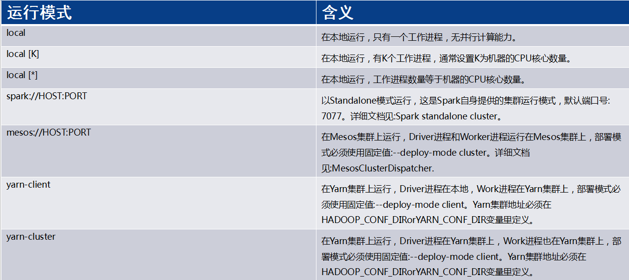 · –master MASTER_URL :决定了Spark任务提交给哪种集群处理。