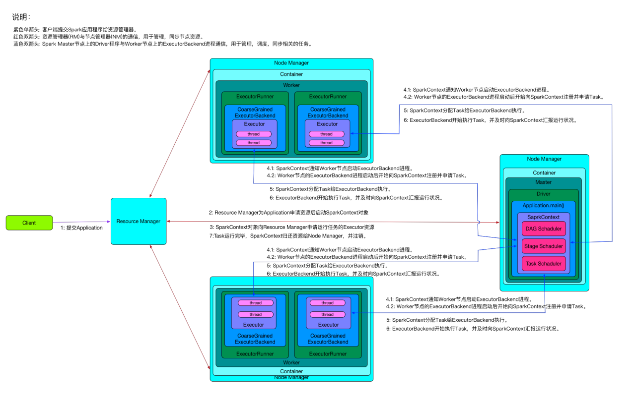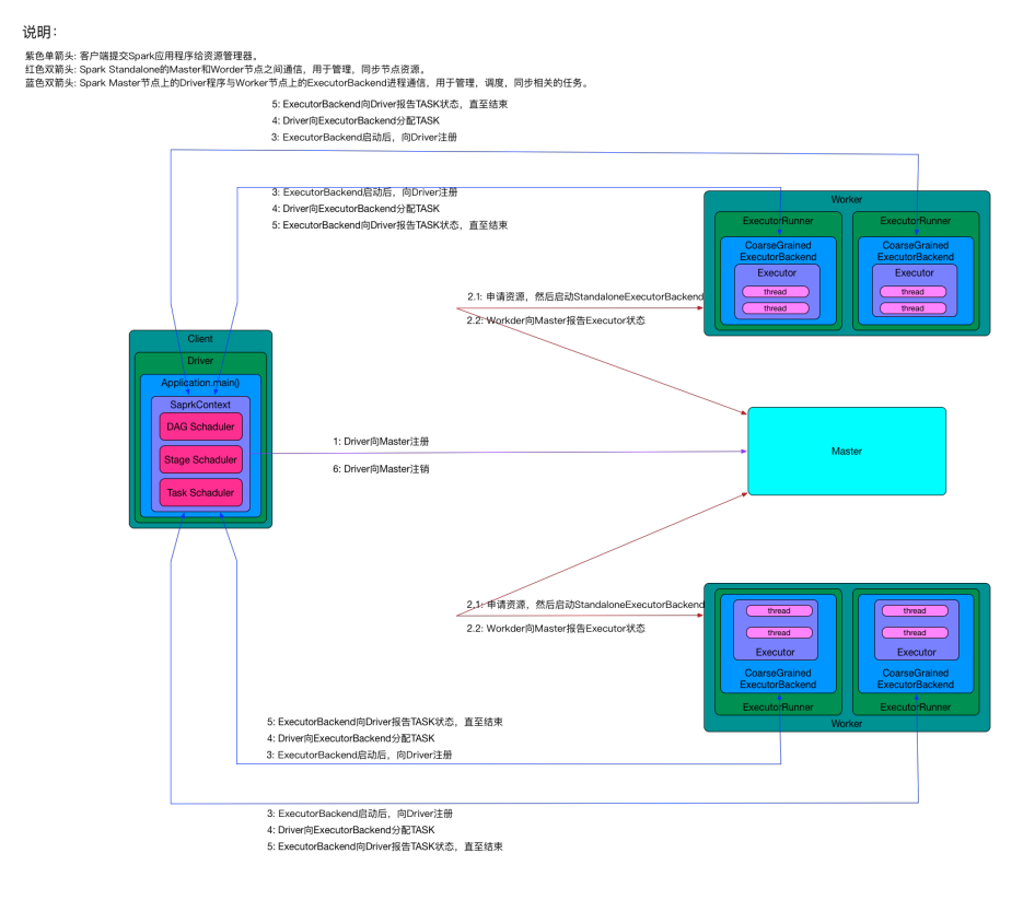 上面的过程反映了Spark在standalone模式下,整体上客户端、Master和Workder节点之间的交互。对于一个任务的具体运行过程需要更细致的分解,分解运行过程见图中的小字。