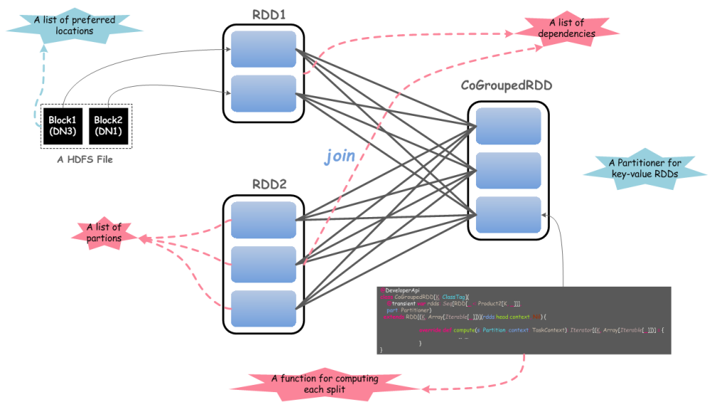 RDD(Resilient Distributed Datasets),弹性分布式数据集,它是对分布式数据集的一种内存抽象,通过受限的共享内存方式来提供容错性,同时这种内存模型使得计算比传统的数据流模型要高效。RDD具有5个重要的特性,如下图所示: