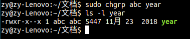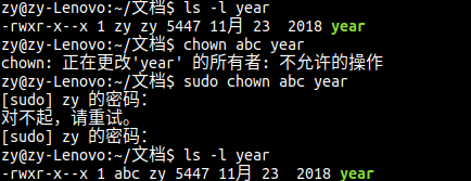 使用chown命令的时候,需要使用管理员权限。命令前要加上sudo。可以看到,把文件拥有者改成了用户abc,文件所在组仍旧是zy。chown就是change owner的意思。