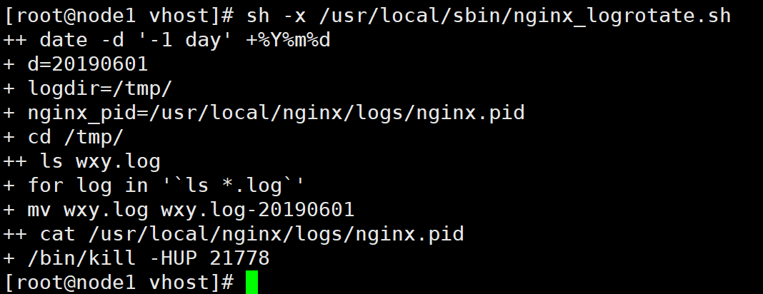 #! /bin/bash #定义前一天日期 d=`date -d "-1 day" +%Y%m%d` #日志路径 logdir="/tmp/" nginx_pid="/usr/local/nginx/logs/nginx.pid" cd $logdir for log in `ls *.log` do mv $log $log-$d done #重新加载nginx,否则不会生成新的日志文件。类似(nginx -s relod) /bin/kill -HUP `cat $nginx_pid` -