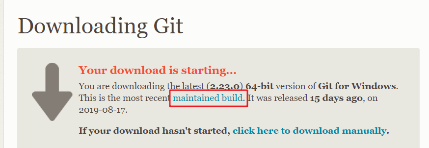 如果不下载最新版,下载其他版本,可以取消最新版的下载,点击 maintained build 进入 Git for windows 页面。