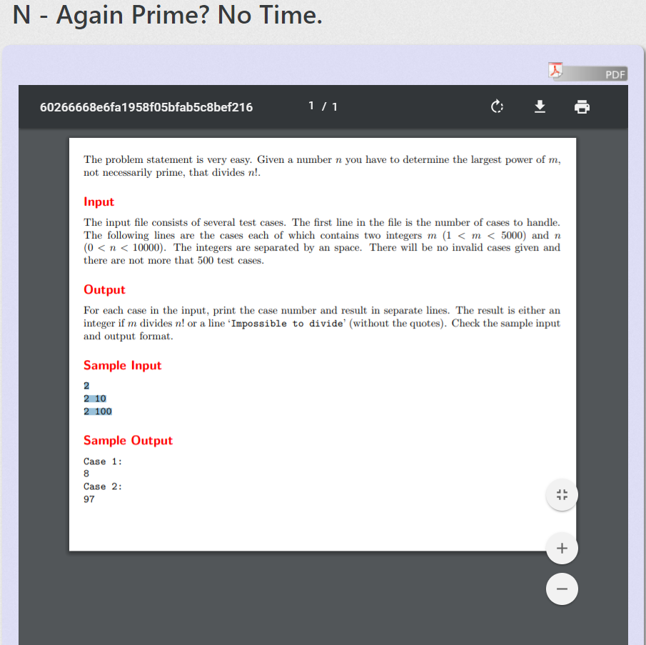 给一个m,给一个n,求m的最大次方数ans,能被n!整除。