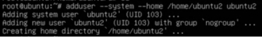 创建用户,并设置所属的组(1000表示的是当前存在的组ubuntu,就是把ubuntu2用户归属到ubuntu组内),密码,这种创建的用户是可以进行登陆的:
