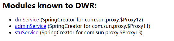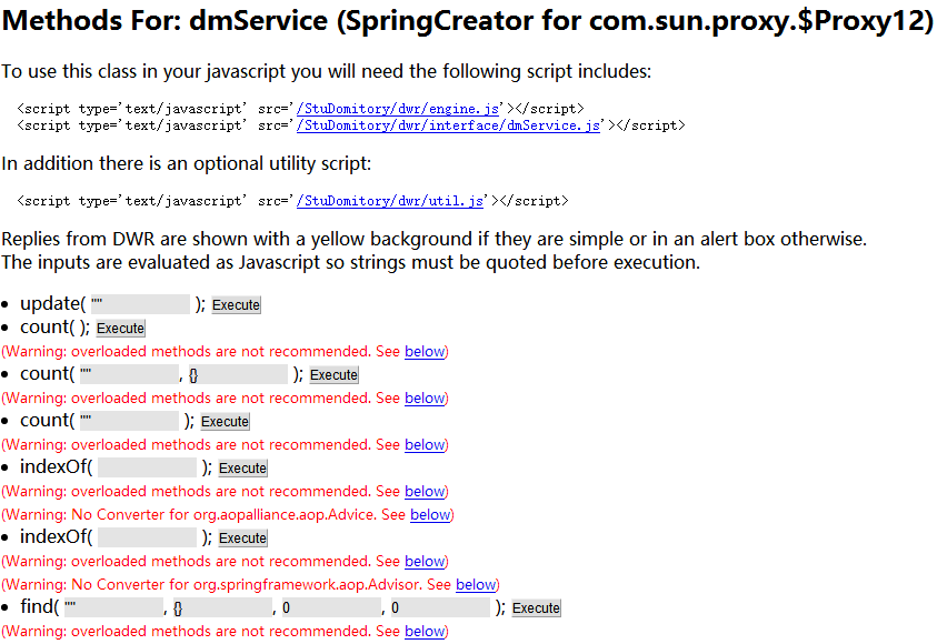 例如,当访问“/工程名/dwr”时,正常情况应该显示当前系统中对外暴露的JS方法的列表,但在Struts2的默认配置下,却得到“There is no Action mapped for namespace / and action name dwr.”