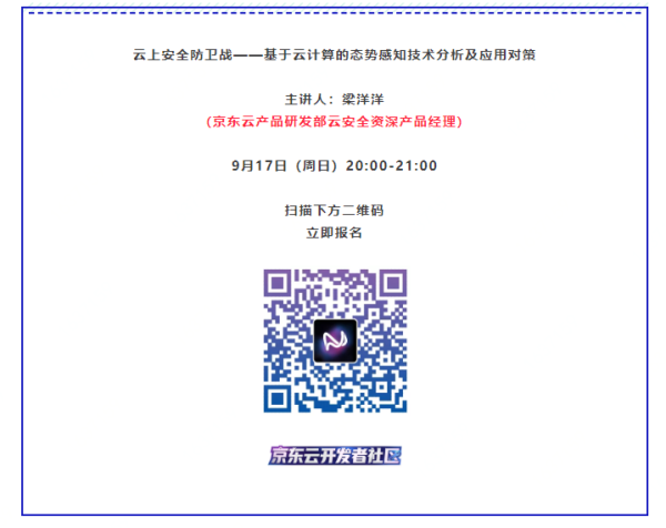 针对以上问题,9 月 17 日京东云在线课堂,将为大家带来一场聚焦于“云上安全防卫战——基于云计算的态势感知技术分析及应用对策”的免费课程!