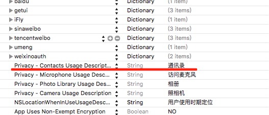 最近升级了Xcode8.0,真是很多坑啊,填完一个来另外一个,今天又遇到了一个,用Xcode8.0上传项目时被驳回说是info.plist里面没有设置NSPhotoLibraryUsageDescription、NSCameraUsageDescription、NSContactsUsageDescription、NSMicrophoneUsageDescription等字段,之前这些都是预设的不用加,现在强制了,真是郁闷,下面贴上解决方案