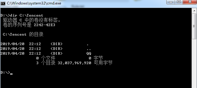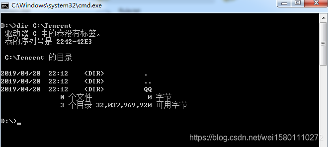 注意:只能进入当前盘符中的目录。其中”CD\”为回到根目录,”CD..”为回到上一层目录。