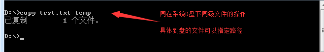 格式为”COPY [源目录或文件] [目的目录或文件]”,比如”COPY C:*.COM D:\”