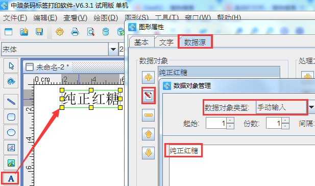 2.点击软件左侧的”实心A”按钮,在画布上绘制一个普通文本对象,双击普通文本,在图形属性-数据源中,点击”修改”按钮,数据对象类型选择”手动输入”,在下面的状态框中手动输入你要添加的信息,点击编辑。