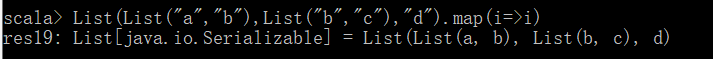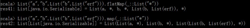 由上可以看出,flatMap执行扁平化时,如果其中一个子元素是List(a:Object,b:Object),会变成a,b 因为将这个子元素的元素打散,就是扁平化,但是a还是a,b还是b,不关心a或者b的类型。