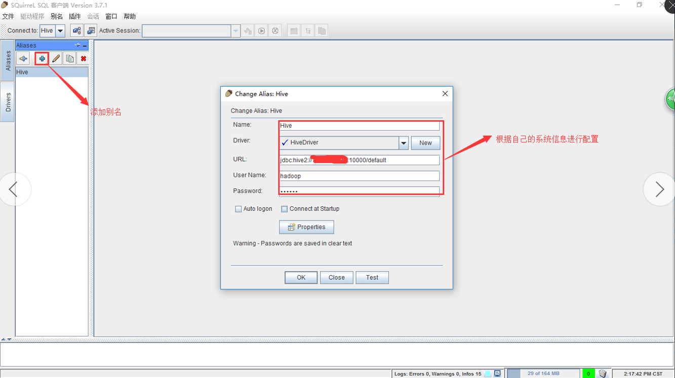 进入最左侧的”Aliases”别名tab页面,点击添加(+),建立一个Hive的链接: