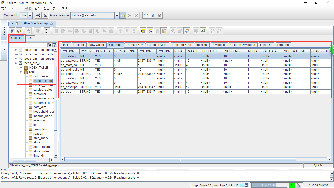 点击”Connect”链接Hive。链接成功之后,双击左侧的Objects下面的TABLE标签,即可列出Hive中所有的表: