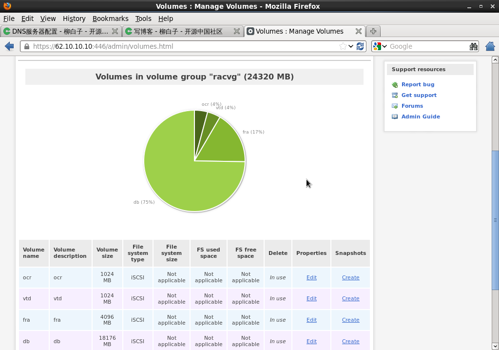2.• Volumes --->Volume Groups--->建好我们的vg组,名字叫racvg,将我们添加的5块磁盘都添加进vg组里面 ---->Add Volume(增加我们的卷组,分为四个组 ocr,vtd,fra,db )
