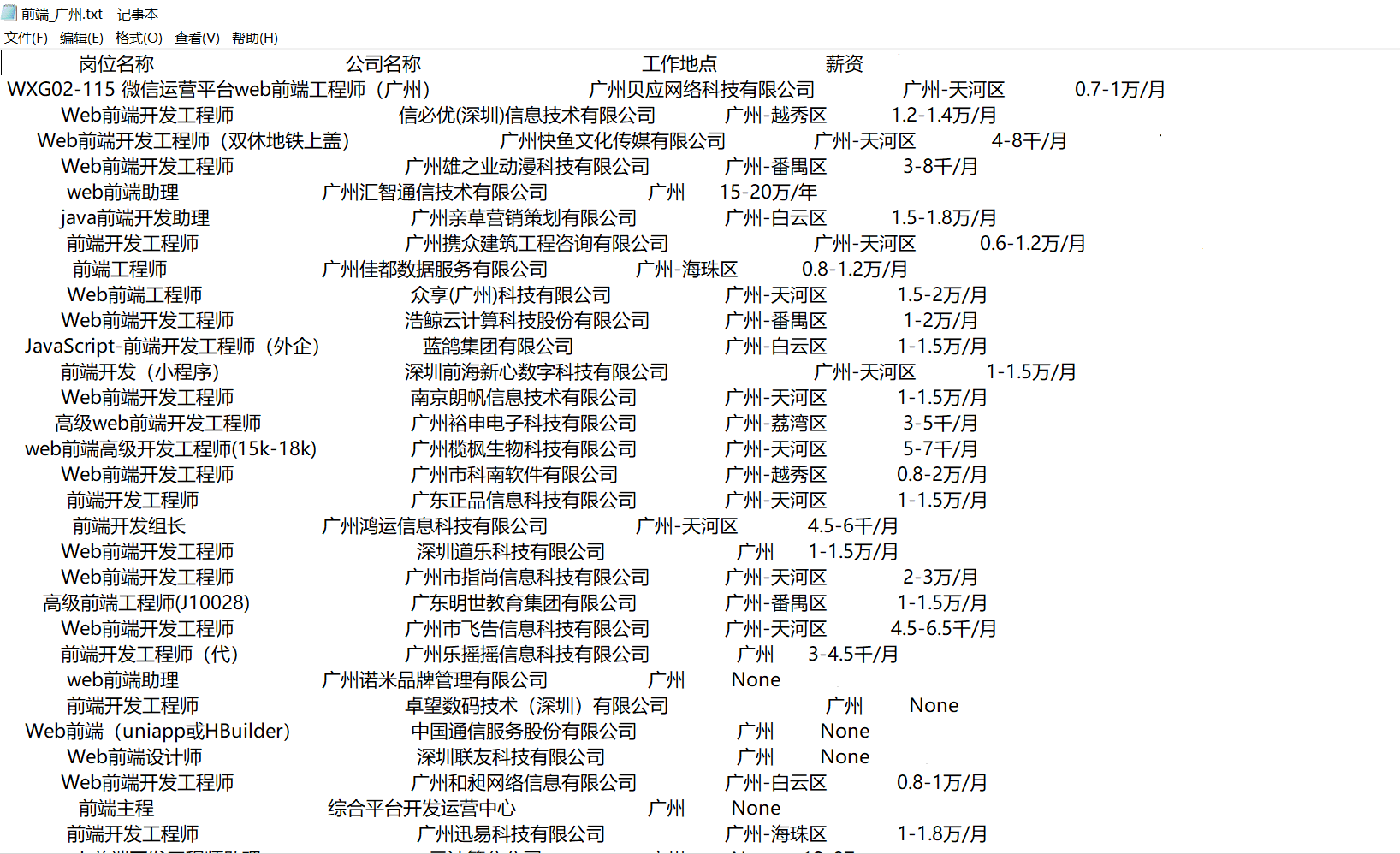 主要是爬取泉州内的数据内容,包括工作名称、薪资、公司名称、以及公司地点