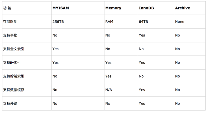 注:如果要提供提交、回滚、崩溃恢复能力的事物安全(ACID兼容)能力,并要求实现并发控制,InnoDB是一个好的选择;如果数据表主要用来插入和查询记录,则MyISAM引擎能提供较高的处理效率;如果只是临时存放数据,数据量不大,并且不需要较高的数据安全性,可以选择将数据保存在内存中的Memory引擎,MySQL中使用该引擎作为临时表,存放查询的中间结果;如果只有INSERT和SELECT操作,可以选择Archive,Archive支持高并发的插入操作,但是本身不是事务安全的。Archive非常适合存储归档数据,如记录日志信息可以使用Archive;