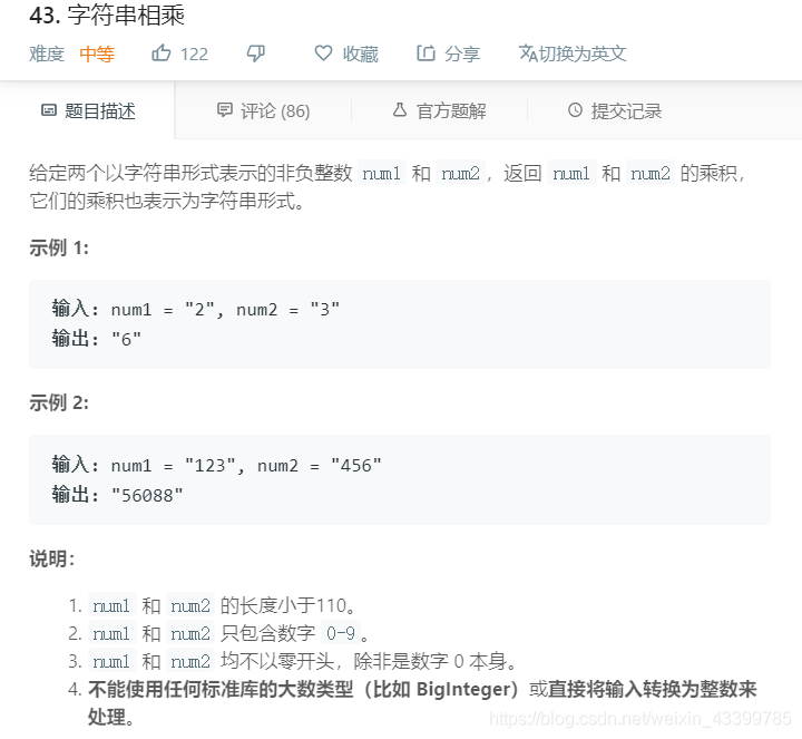 输入是两个字符串形式的非负整数,返回乘积结果的字符串形式,不允许转换成整数再进行处理。即最简单直接return str(int(num1) * int(num2))。