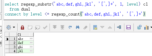 select regexp_substr('abc,def,ghi,jkl', '[^,]+', 1, level) c1