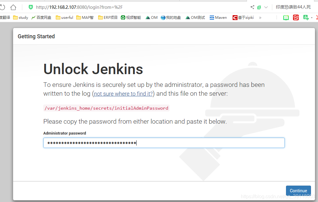 5.jenkins_home中获取密码填入 cat jenkins_home/secrets/initialAdminPassword