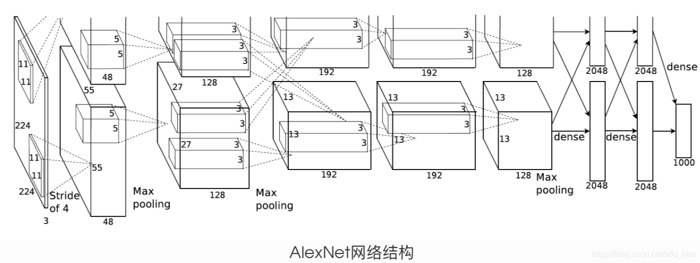 AlexNet第一层中的卷积窗口形状是11*11.因为ImageNet中绝大多数图像的⾼和宽均比MNIST图像的⾼和宽大10倍以上,ImageNet图像的物体占⽤更多的像素,所以需要更大的卷积窗口来捕获物体。 第二层中的卷积窗⼝形状减⼩到5*5,之后全用3*3.此外,第⼀、第二和第五个卷积层之后都使用了窗⼝形状为3*3、步幅为2的最大池化层。⽽且,AlexNet使⽤的卷积通道数也⼤大于LeNet中的卷积通道数数十倍。