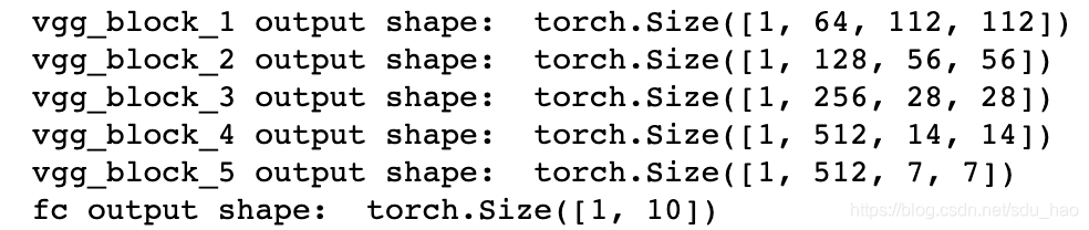 可以看到,每次我们将输入的高和宽减半,直到最终高和宽变成7后传入全连接层。与此同时,输出通道数每次翻倍,直到变成512。因为每个卷积层的窗口⼤小一样,所以每层的模型参数尺寸和计算复杂度与输入高、输入宽、输入通道数和输出通道数的乘积成正比。VGG这种高和宽减半以及通道翻倍的设计使得多数卷积层都有相同的模型参数尺寸和计算复杂度。