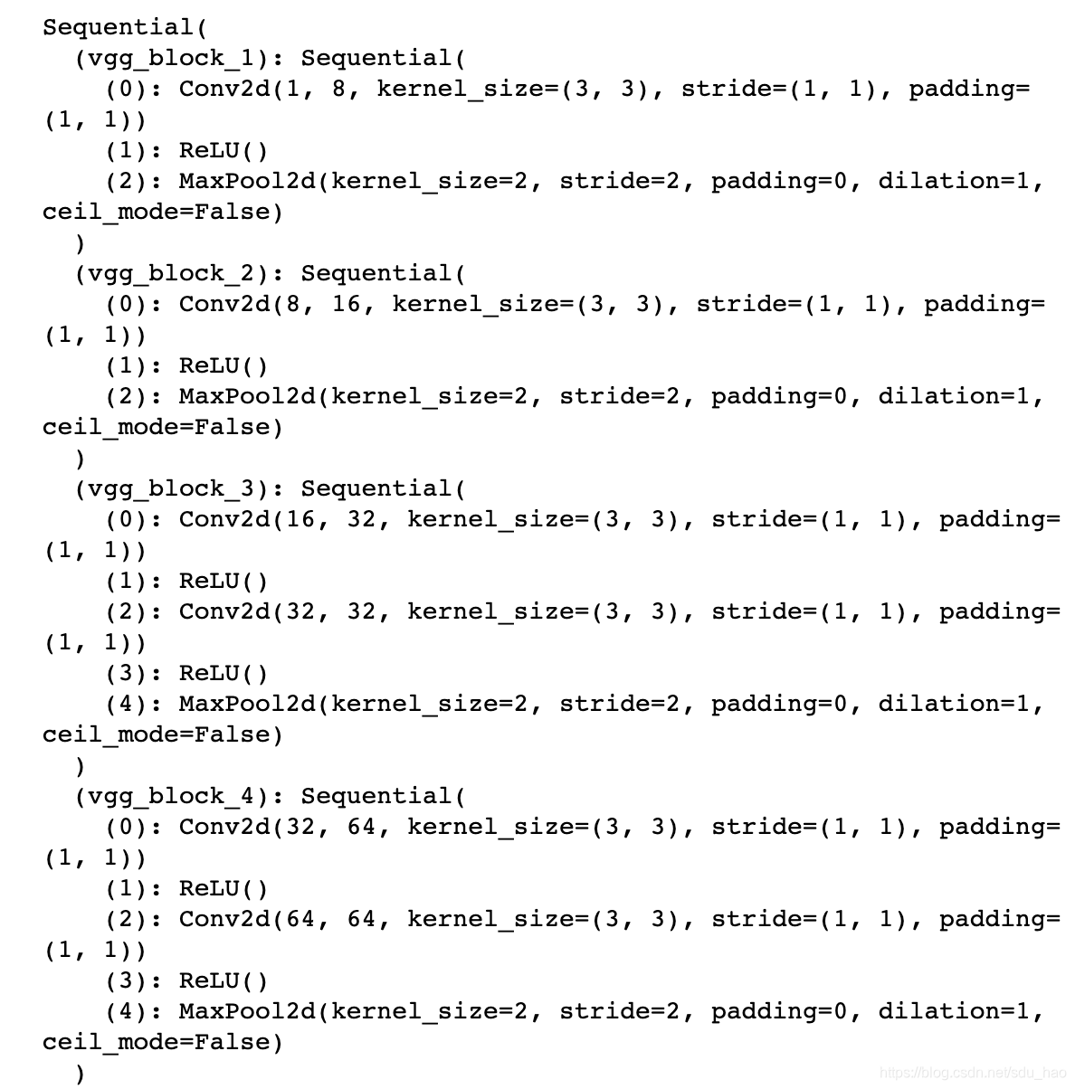 net.add_module("vgg_block_" + str(i+1), vgg_block(num_convs, in_channels, out_channels))