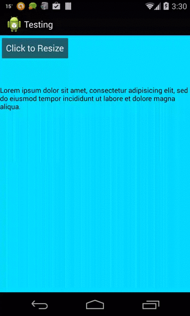 - Before doing any actual resizing we need to force the R.id.parent layout to keep a constant size by providing it with a fixed size in pixels. In run time, after the layout pass we update the layoutParams to set the fixed size. We do it after a layout pass so we know that the fixed size we set is based on the system's calculations of the required size (i.e. after all the match parent/wrap content layout calculations are done).