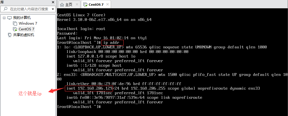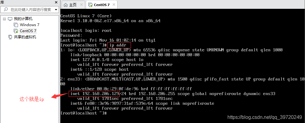 (1)自己安装的虚拟机CentOS充当测试服务器的话,查看虚拟机IP方法如下,虚拟机输入命令: