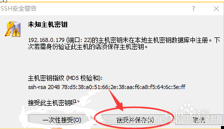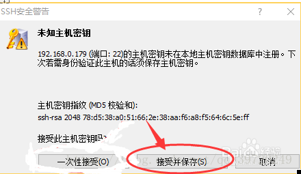 注意:xshell首次连接,一定要选择“一次性接受”: