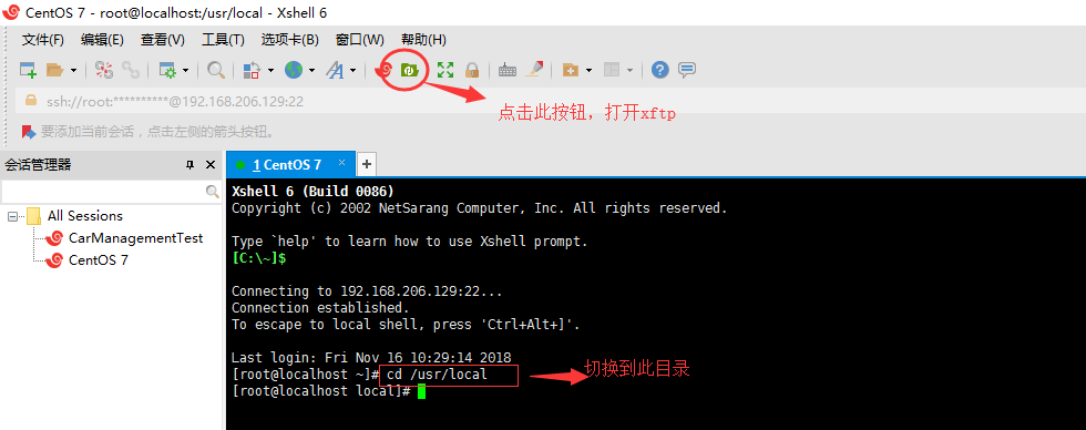 ①xshell先输入linux命令,切换到usr/local目录,打开xftp: