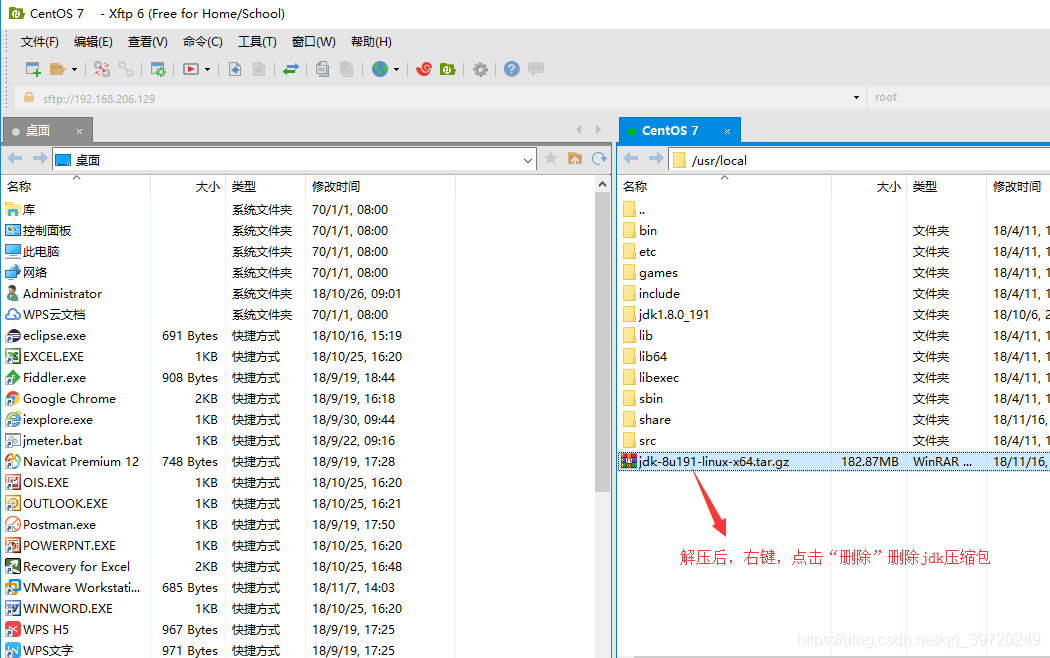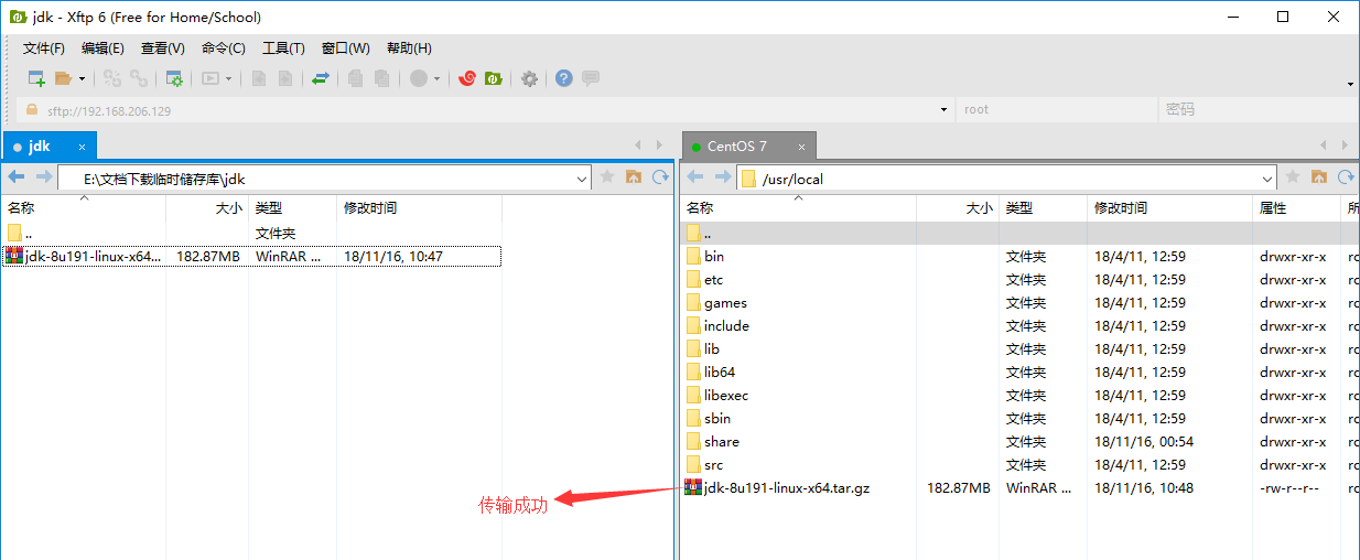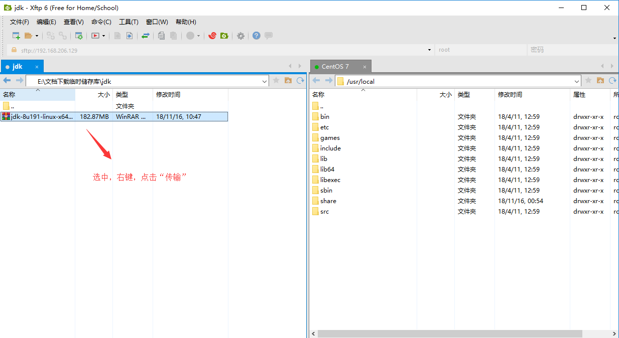 (1)有安装xftp的话,可以直接用xftp上传jdk到服务器上,没有的话就用步骤(2)命令上传jdk,用xftp方法如下: