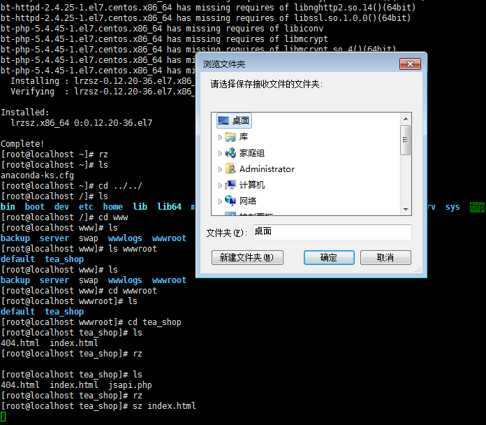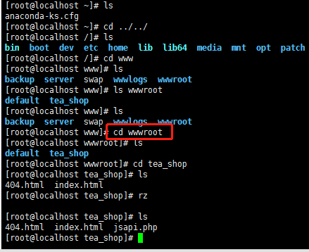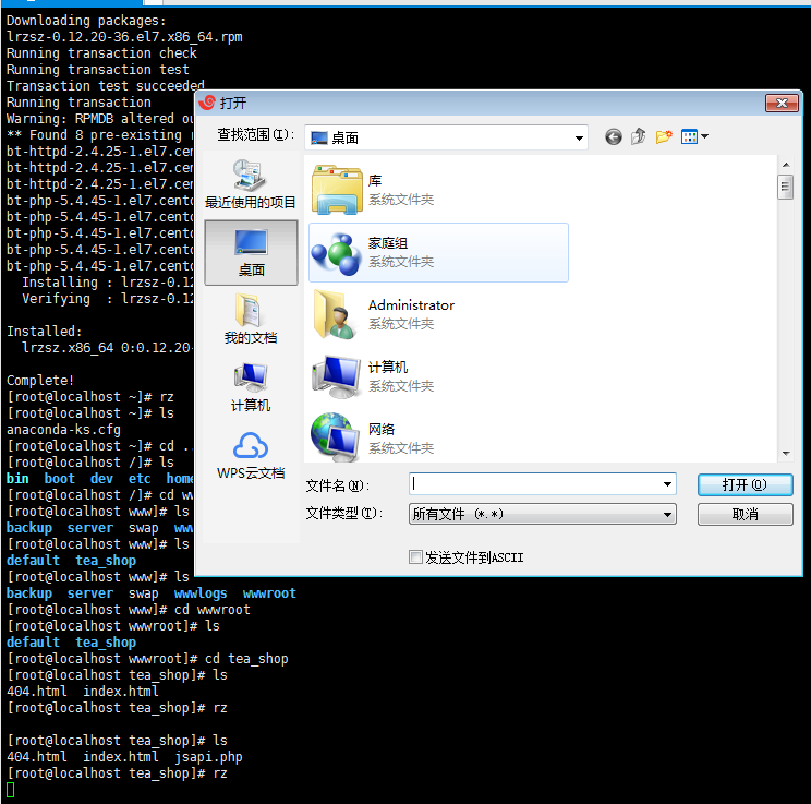 4,配合cd命令,进入到网站根目录,rz,会弹出文件选择框,选择对应文件,稍等即可,输入ls,即可查看刚上传的文件