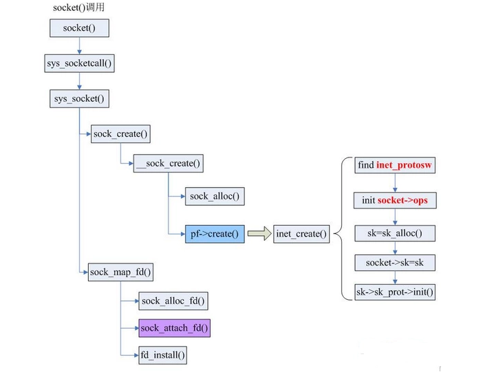 socket()调用sys_socketcall()系统调用。bind,connect等等函数都需要sys_socketcall()作为入口。