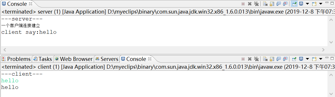 这里只有一个客户端和一个服务端通信,也比较简单,就是服务端把客户端发来的消息再返回给客户端。我们来看一下运行结果吧。