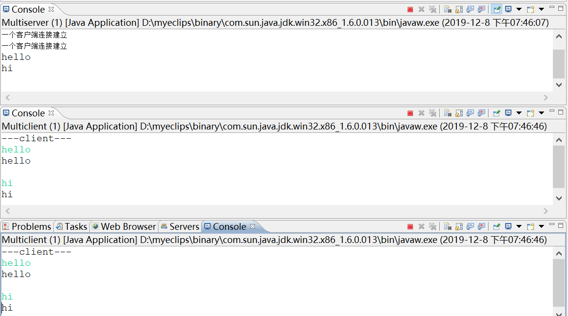 这里服务器是阻塞式监听多个客户端的,为了响应多个客户,封装成了多线程。每个客户端来请求服务的时候都是一个channel,而服务器在和一个客户端建立连接后又可以和其它的客户端建立连接。把具体的响应过程全部写到了run()方法中。封装了一个单独的工具类Util用于释放资源。把接收消息和发送消息单独封装成一个类,方便使用。且有利于代码的维护和重写。我们来看看运行结果吧: