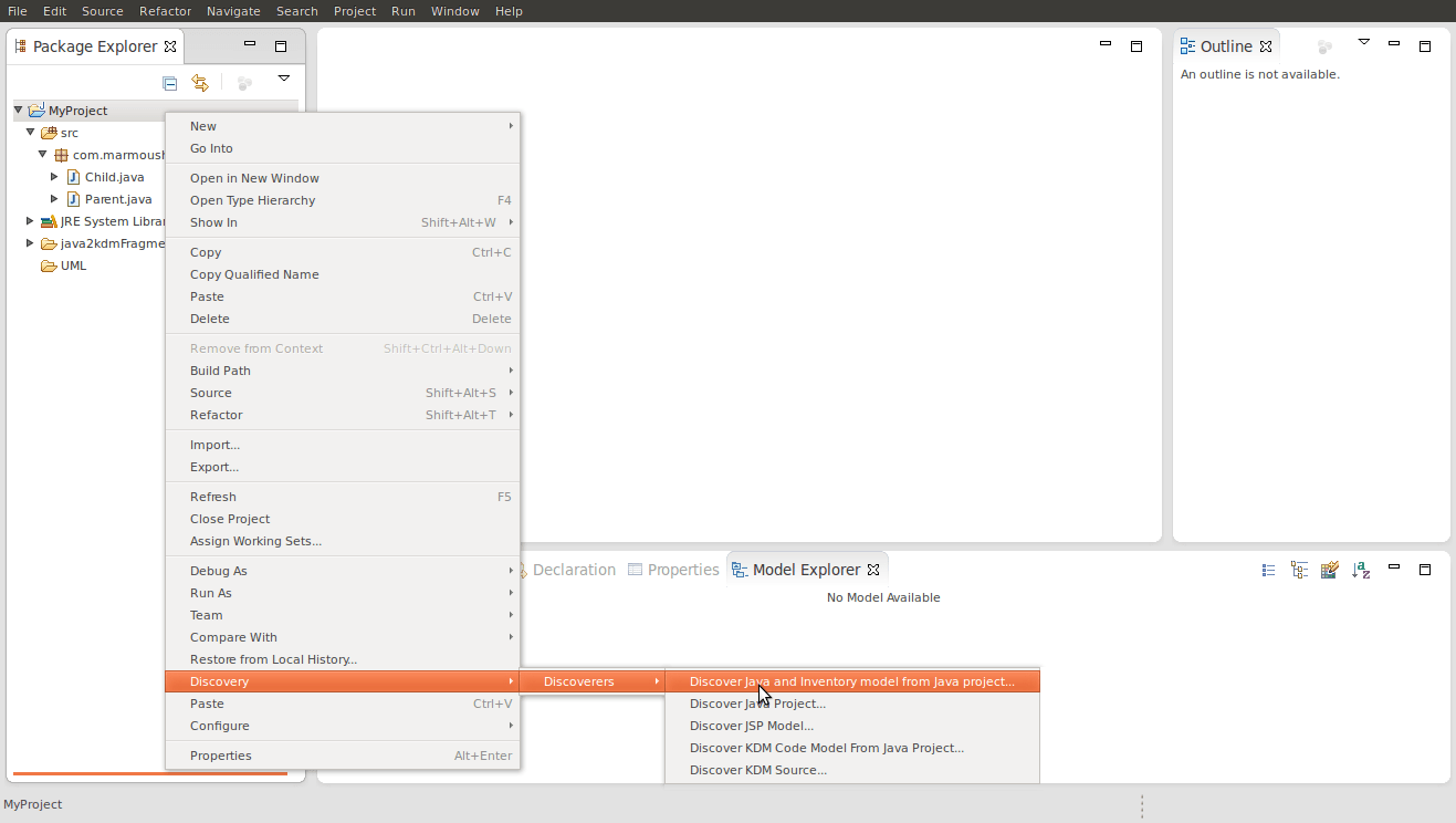 - Right click over the project name -> Discovery -> Discoverer -> Discover Java and inventory model from java project, a file called MyProject_kdm.xmi will be generated.
