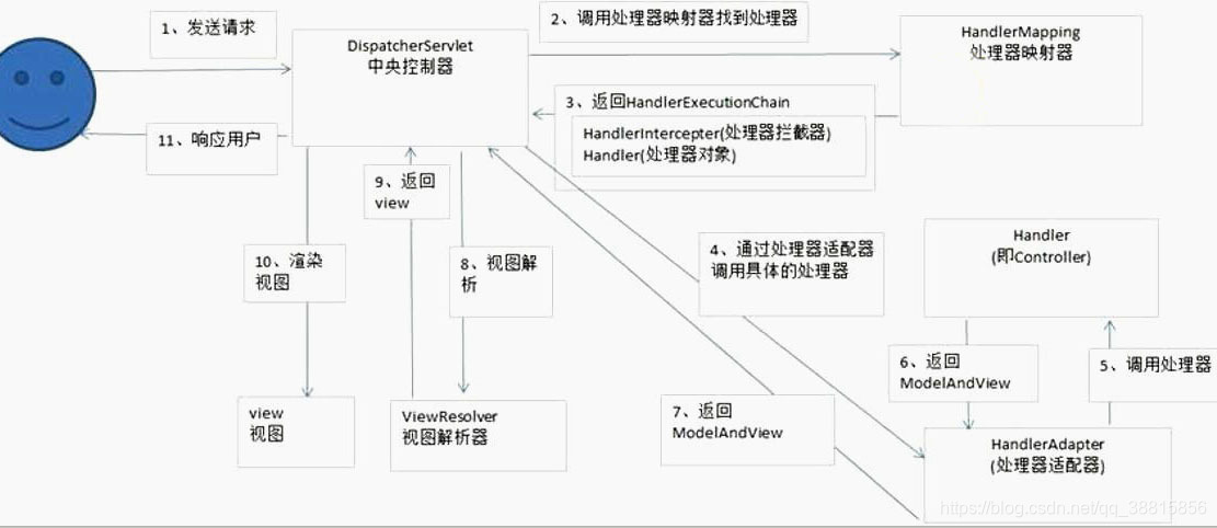 DispatcherServlet是前置控制器,配置在web.xml文件中的。拦截匹配的请求,Servlet拦截匹配规则要自己定义,把拦截下来的请求,依据相应的规则分发到目标Controller来处理