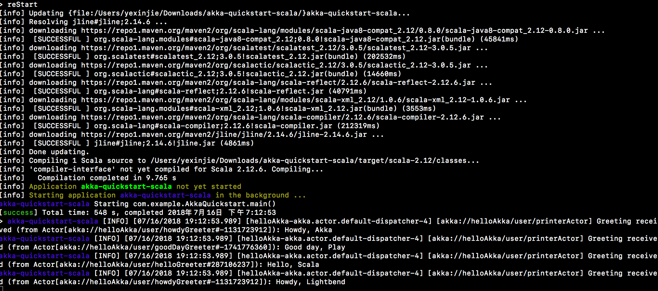 然后执行 reStart 来构建项目和运行 Hello World,可以看到以下的输出,还可以看到 Actor 和我们打的招呼。