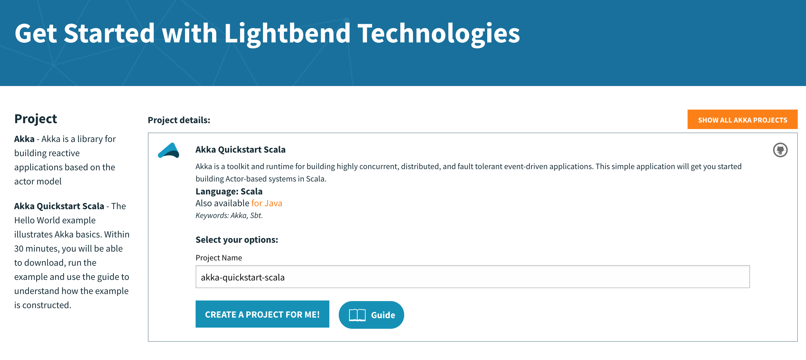 Actors是的Akka的执行单位,Actor模型是一个抽象概念,它使得编写并发的、并行的和分布式的系统变得更加容易。官方给了一个 “helloworld” 示例,演示了基本知识,我们可以在如下的页面创建一个项目,点开旁边的 show all akka projects 可以看到所有的示例(https://developer.lightbend.com/start/?group=akka)。