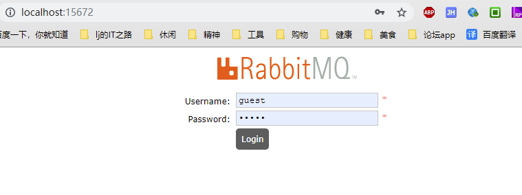 2.启动以后,我们打开浏览器输入地址:http://localhost:15672 访问(默认用户名密码为guest)。如下图所示