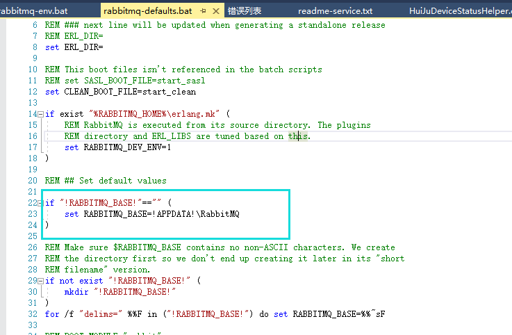 系统RabbitMQ默认读取的配置文件路径在%AppData%\RabbitMQ中,可从以下脚本文件可以看出