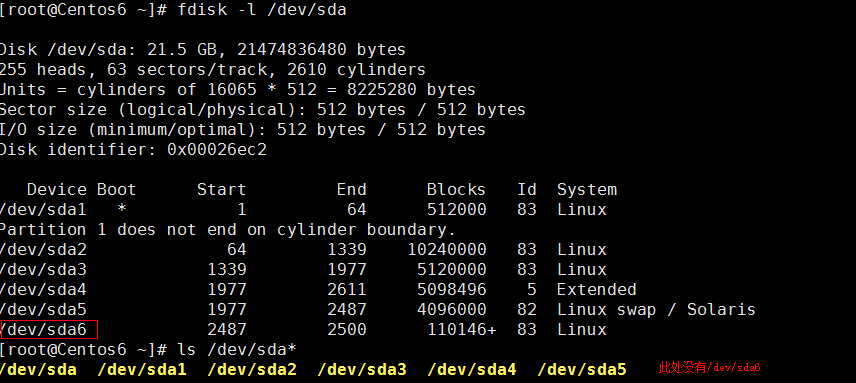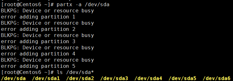 [root@Centos6 ~]# partprobe /dev/sda //仍然没有同步,用下面的命令可以同步